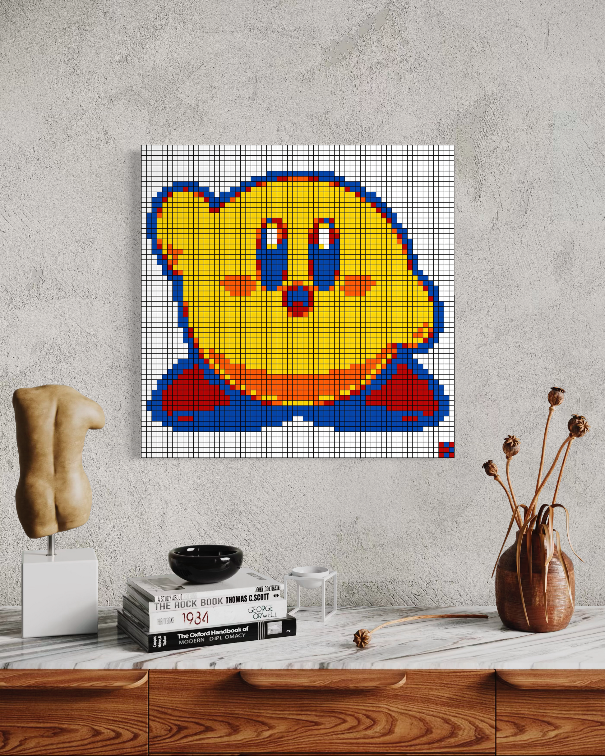 Originals: Crafted entirely from real Rubik’s Cubes, each mosaic is glued together and mounted securely to a backboard. Depending on the size, originals are also professionally framed for added stability and presentation. These one-of-a-kind works are the true embodiment of cube art — no two originals are ever the same.