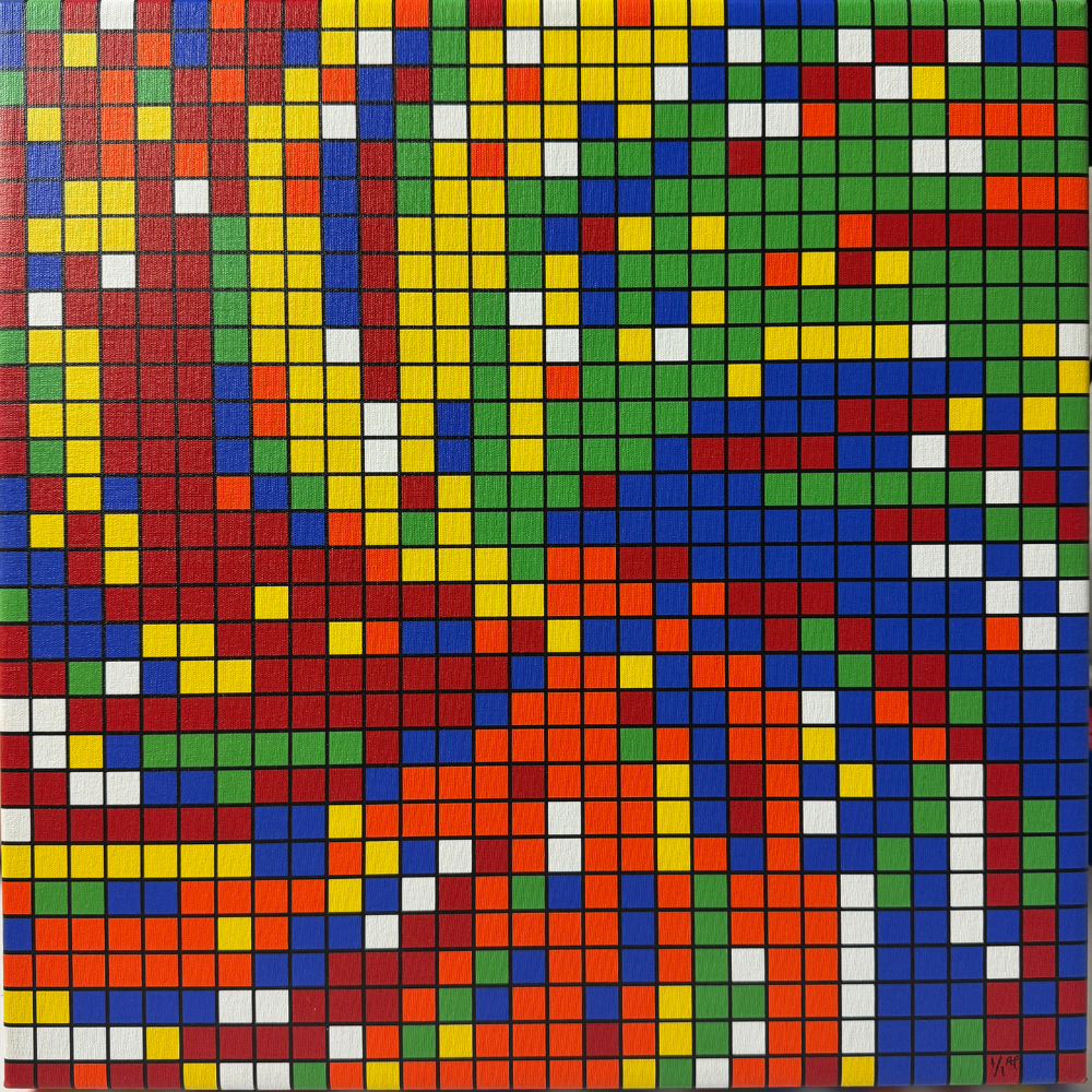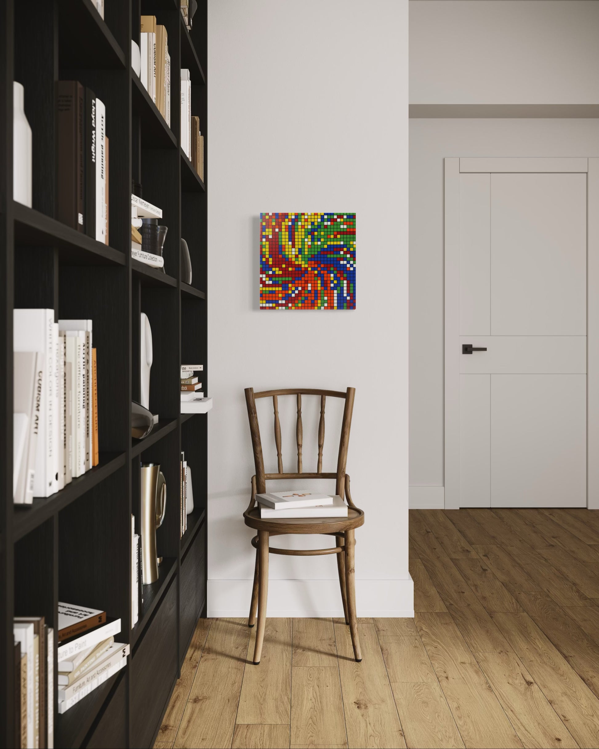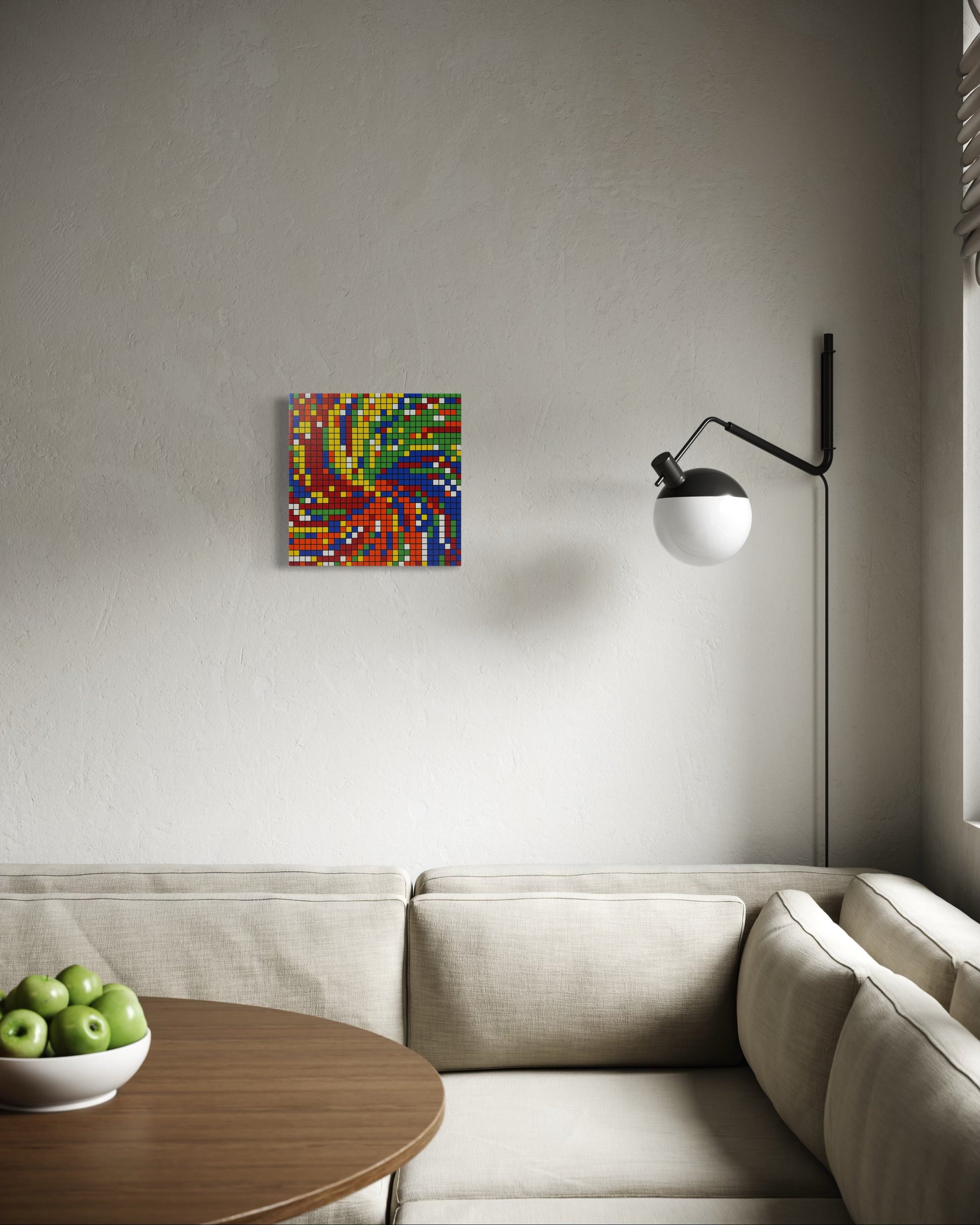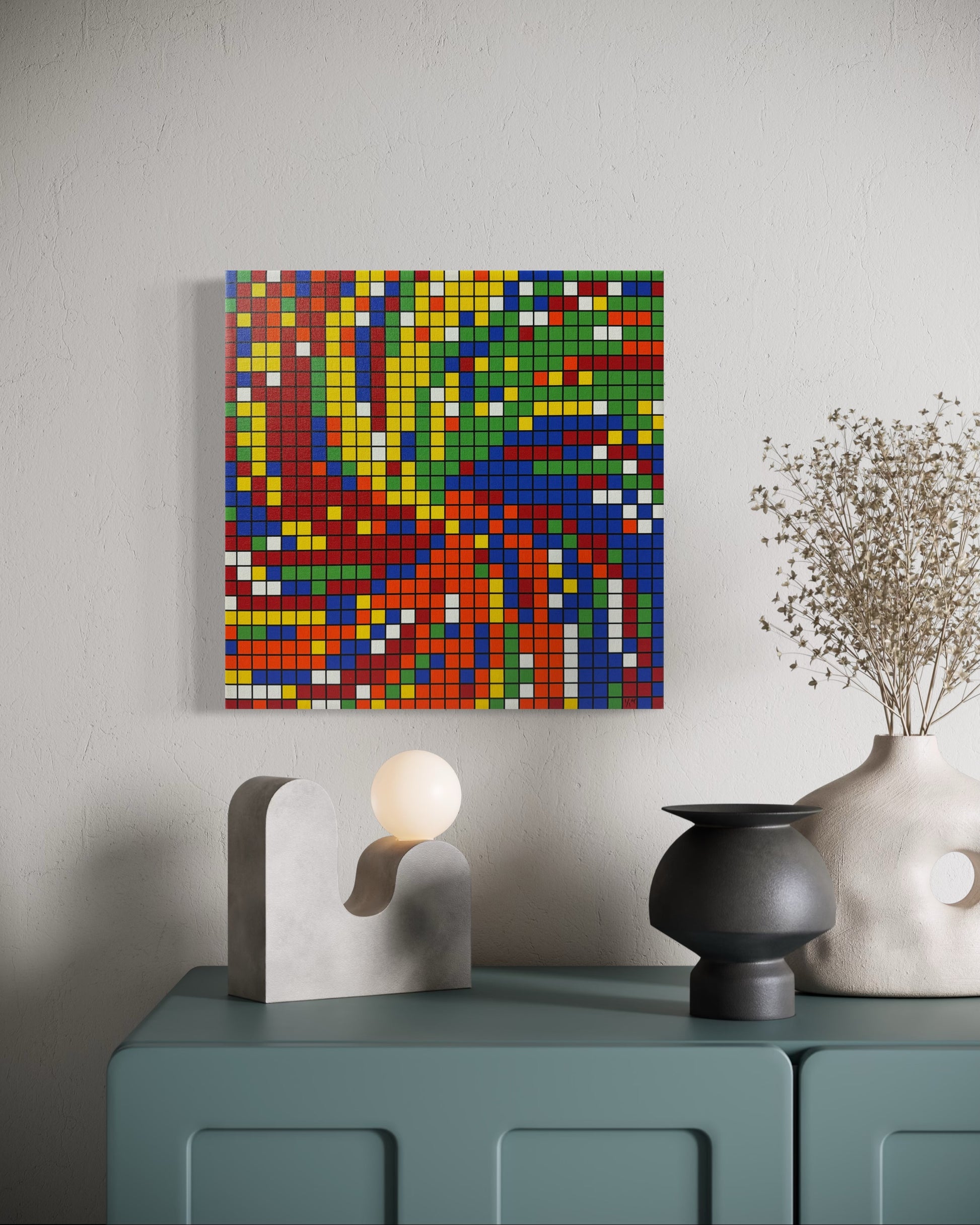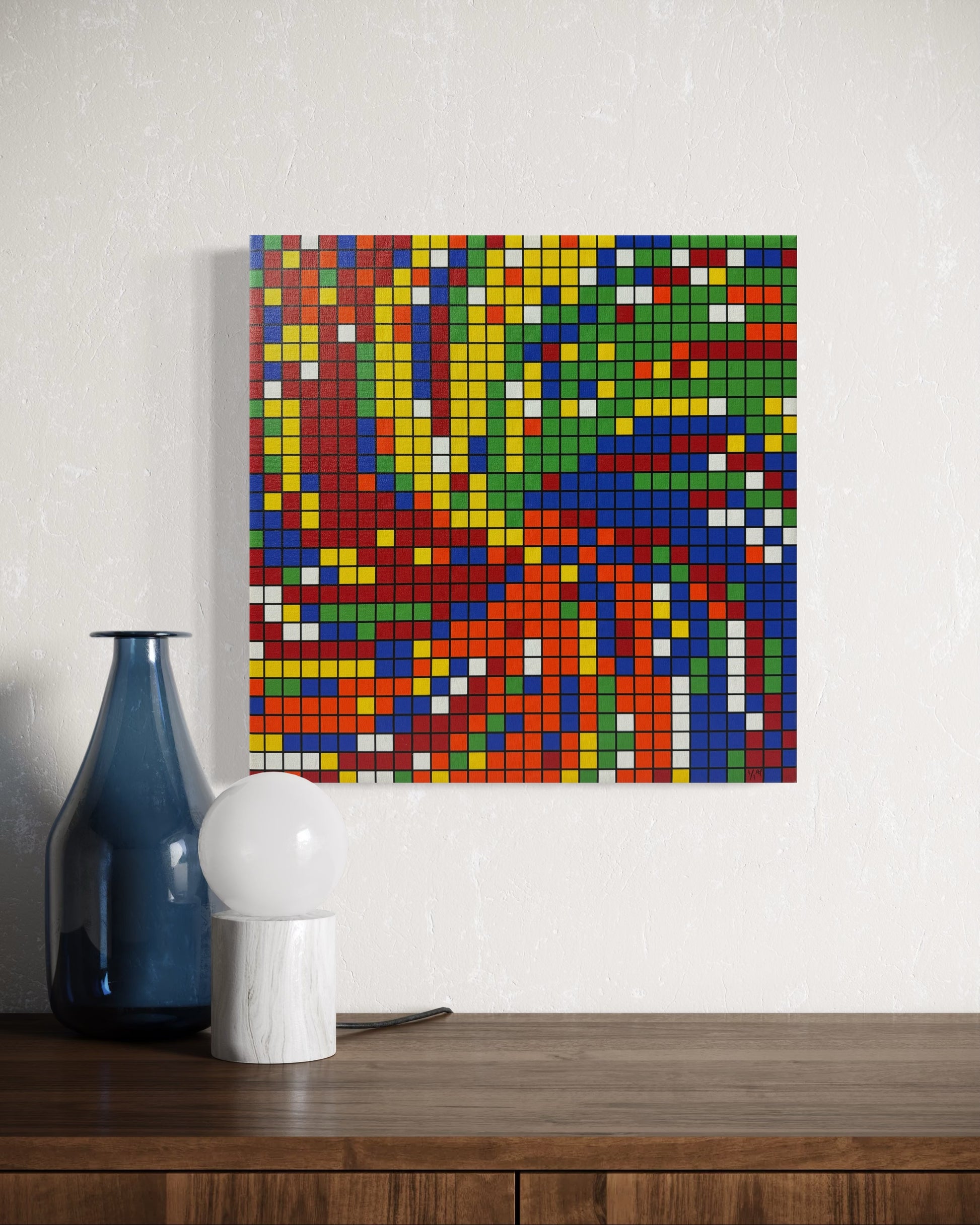 Canvas Prints (14" x 14"): Printed on premium Satin Canvas (325 gsm, 65% cotton / 35% polyester) with archival inks to ensure the longest-lasting print without yellowing. To preserve the authenticity of the original cube mosaic, the sides of the canvas feature printed scrambled cubes for a truly unique finish.