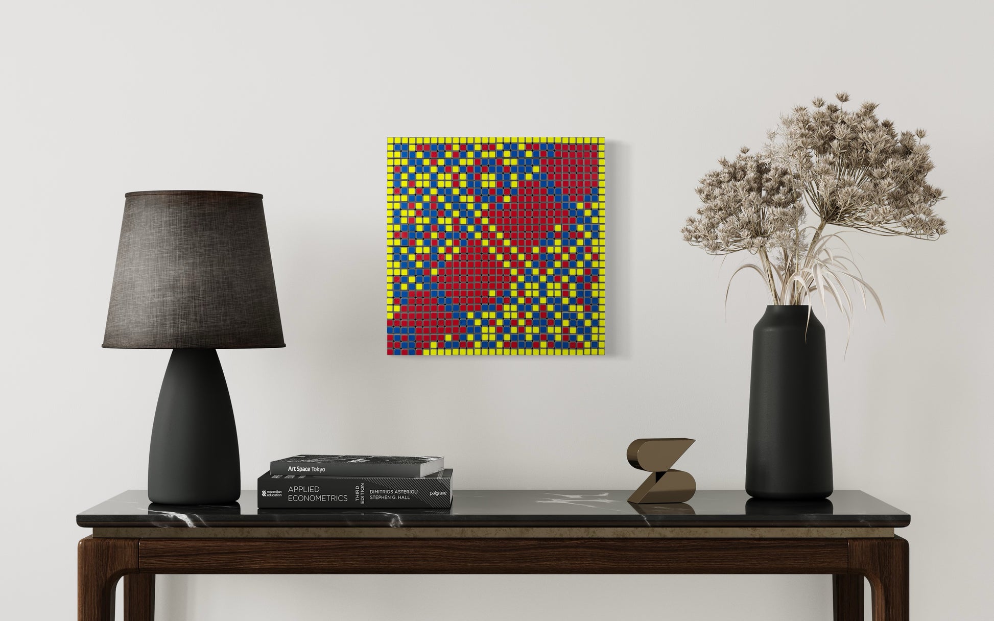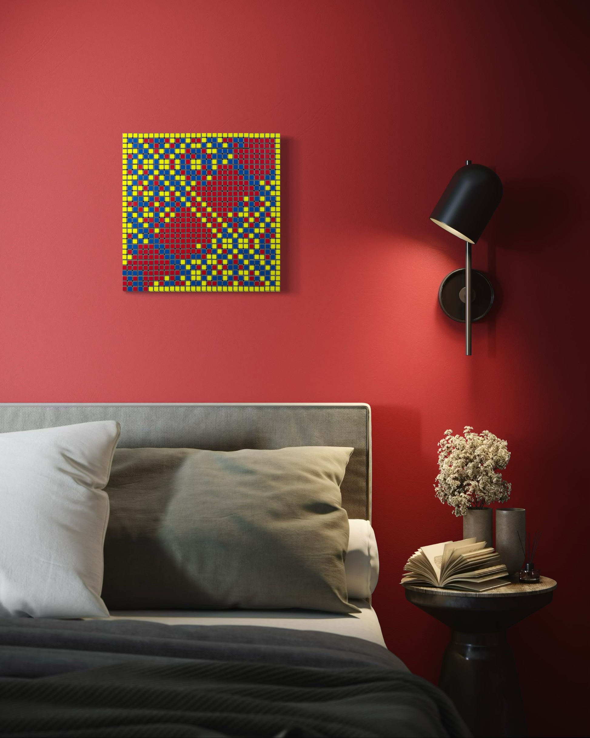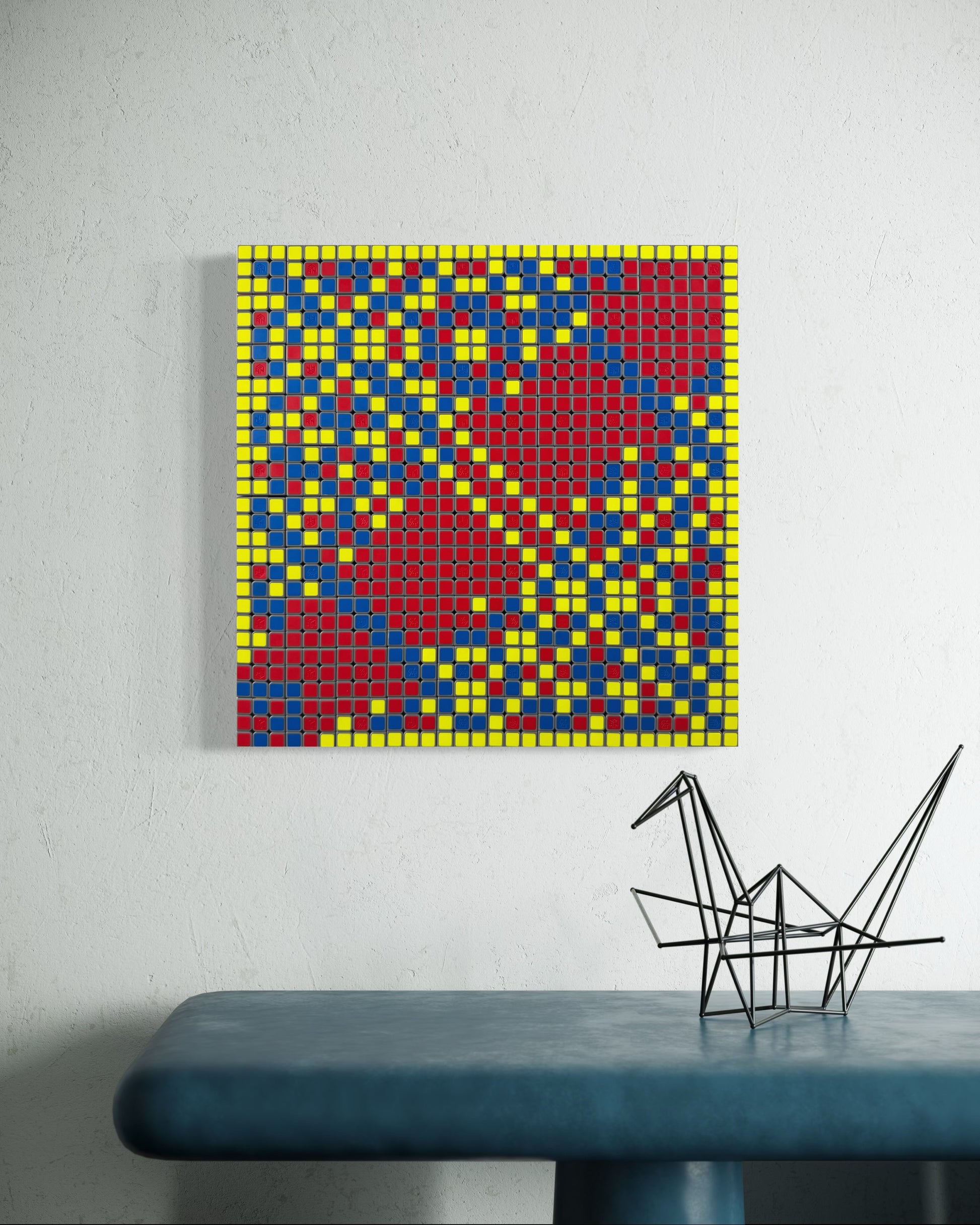 Canvas Prints (14" x 14"): Printed on premium Satin Canvas (325 gsm, 65% cotton / 35% polyester) with archival inks to ensure the longest-lasting print without yellowing. To preserve the authenticity of the original cube mosaic, the sides of the canvas feature printed scrambled cubes for a truly unique finish.