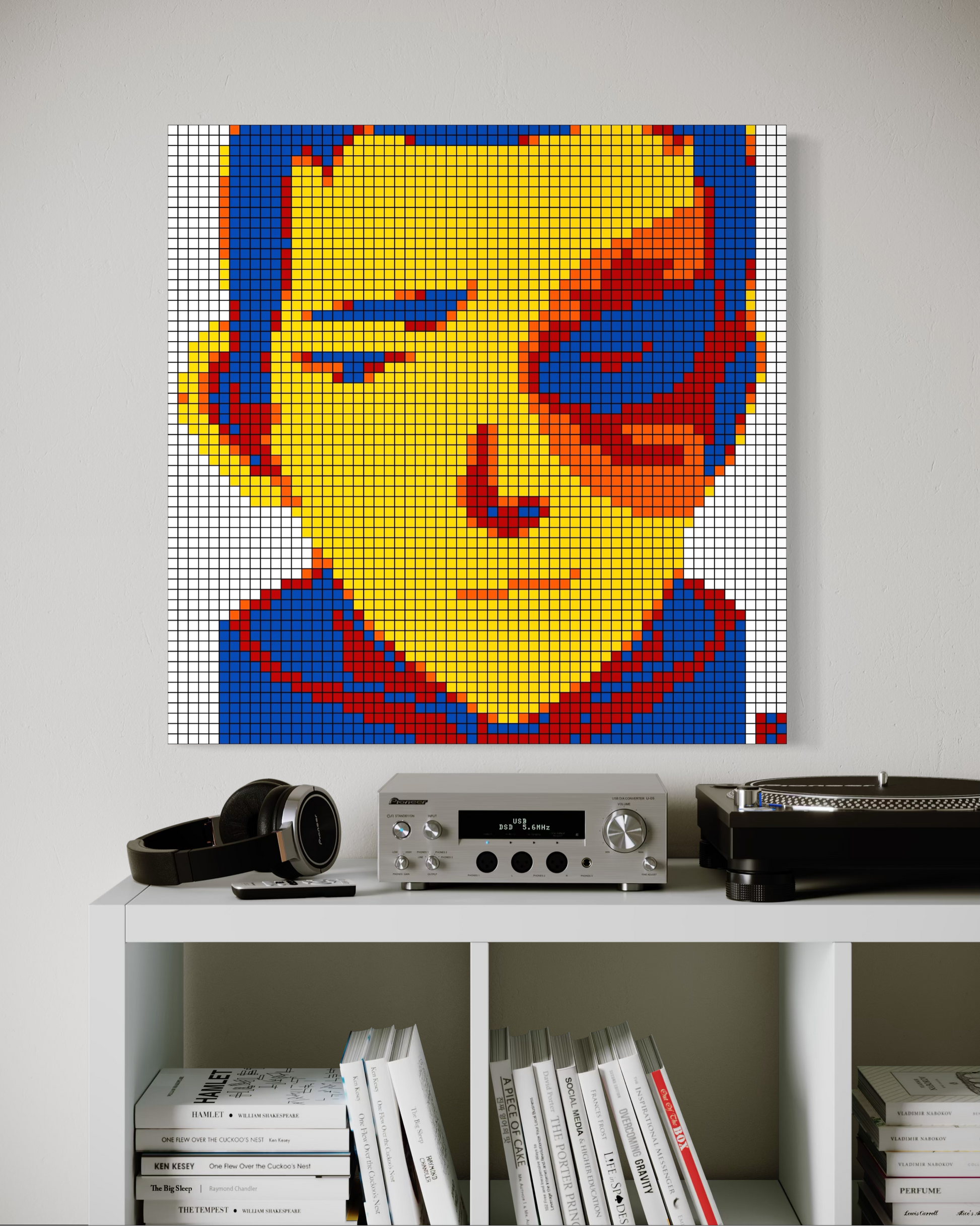 Originals: Crafted entirely from real Rubik’s Cubes, each mosaic is glued together and mounted securely to a backboard. Depending on the size, originals are also professionally framed for added stability and presentation. These one-of-a-kind works are the true embodiment of cube art — no two originals are ever the same.